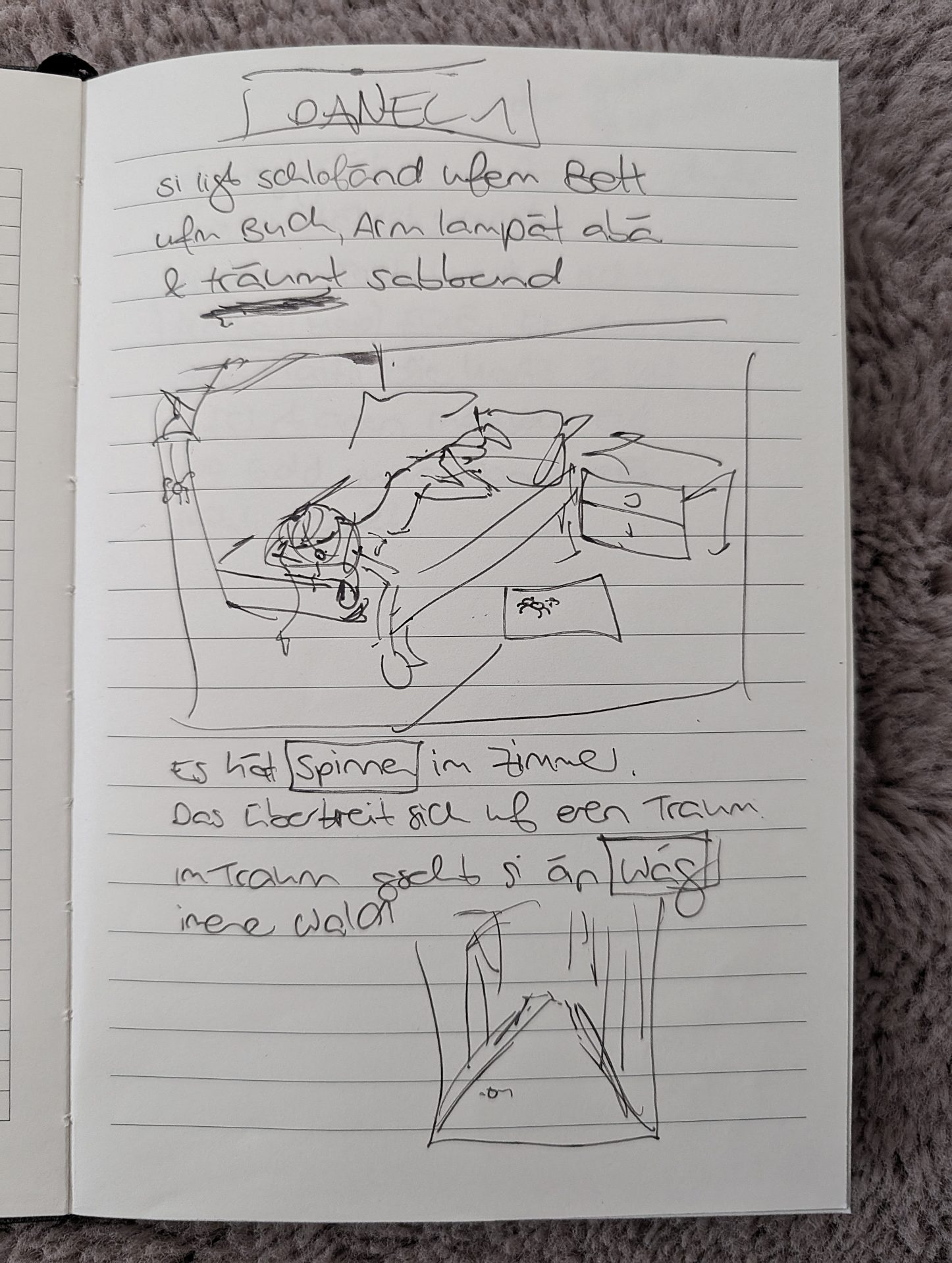 Hier siehst du von links nach rechts die ganze Liste mit allen Begriffen, die auch in dieser Reihenfolge im Comic vorkommen. Das zweite Bild ist eine erste Skizze der ersten Seite. Und zuletzt findest du eine überarbeitete Skizze von Seite Zwei. Ich habe den Comic als Ganzes auf dem iPad gezeichnet 😀
