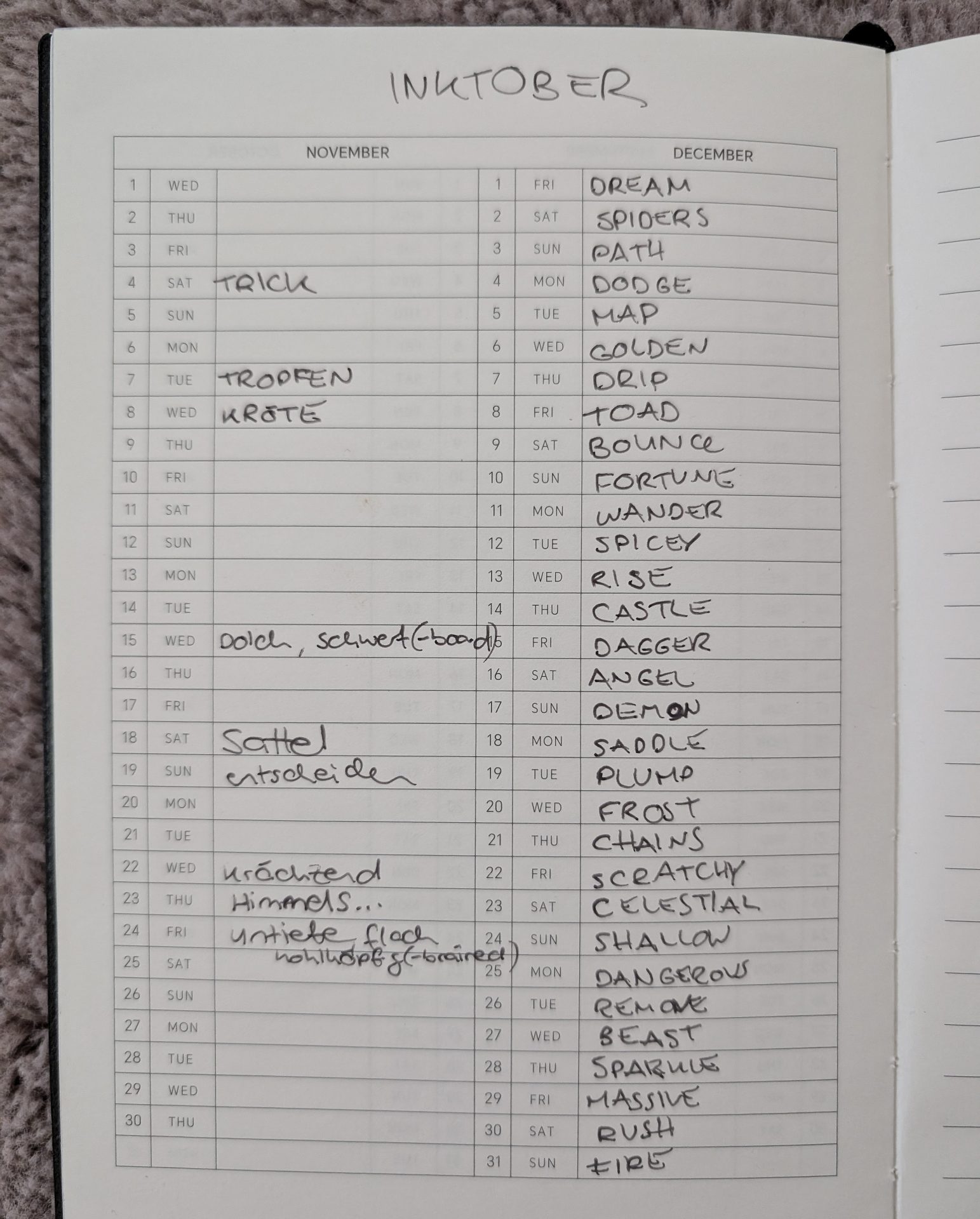So habe ich mich für den Oktober entschieden, an dem ich immer bei der Inktober-Challenge teilnehme. Das ist eine weltweite Challenge, bei der Künstlerinnen und Künstler jeden Tag im Oktober zu einem vorgegebenen Begriff ein Bild mit Tusche zeichnen sollen. Hier ist ebenfalls die Idee, sich nicht zu überfordern, aber kontinuerlich zu zeichnen. Perfekt also, um meine Hürde zu überwinden. Die Idee für den Comic habe ich bereits eine Woche zuvor grob notiert, um einen roten Faden zu haben. Das Ziel: Jeden Tag eine halbe Seite Comic fertigstellen. Dafür musste auch der Stil etwas sketchy und schnell von der Hand gehen.