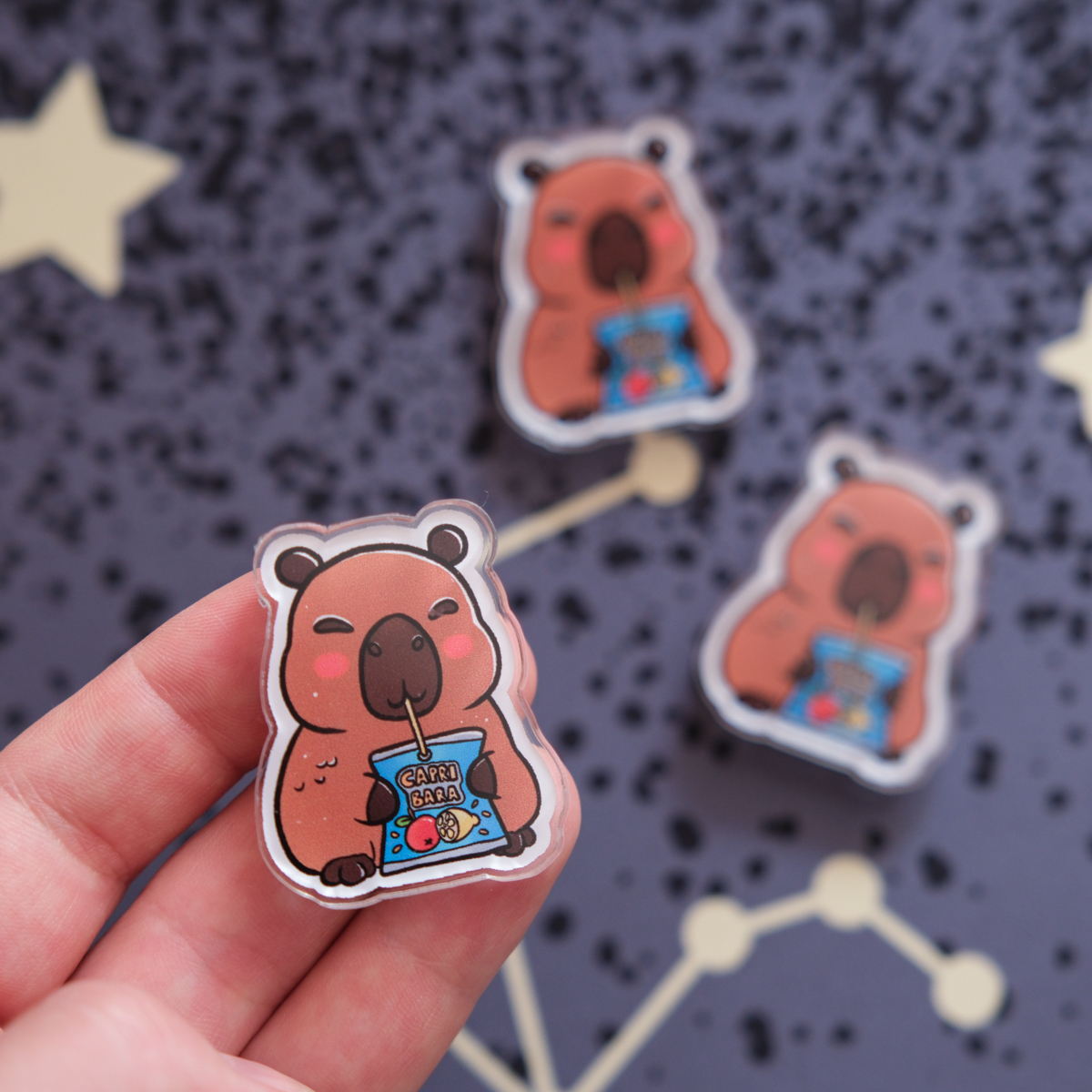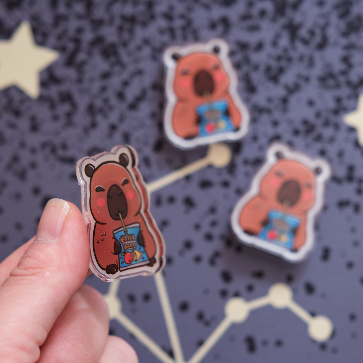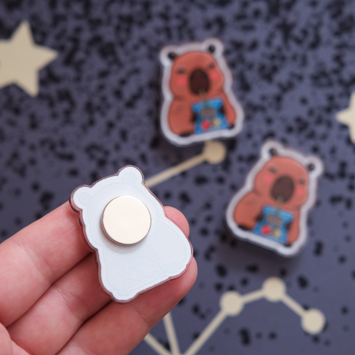 Das Capribara-Magnet ist aus aus transparentem Acryl und etwa 30 Millimeter gross. An der Rückseite ist ein silberner, runder Magnet befestigt. So kann sich das Capribara an deinem magnetischen Kühlschrank festhalten, oder an einem magnetischen Whiteboard, oder zieht vielleicht deinen Crush auf magnetische Weise an? Letzteres (leider) ohne Gewähr.